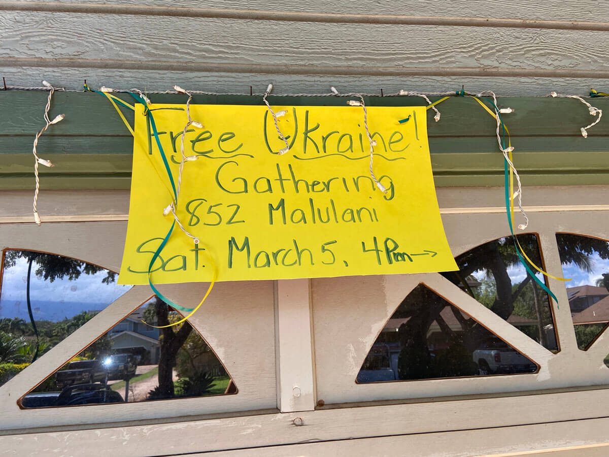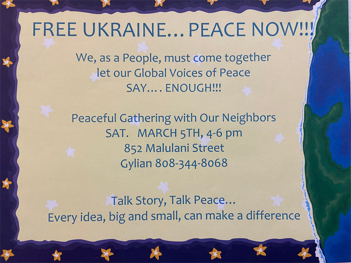 On March 5, from 4-6 pm Hawaii time, I (Gylian) sent out flyers for neighbors to gather. Neighbors gathered in my driveway and shared their sadness, frustration, upset about Ukraine. What can we do?… we can’t have a world war.